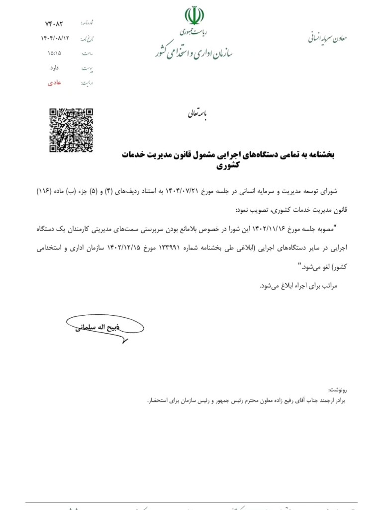 بخشنامه لغو امکان انتصاب سرپرست مشاغل حساس و مدیریتی از میان کارکنان دستگاه های اجرایی دیگر (بخشنامه شماره ۷۴۰۸۲ مورخ ۱۴۰۴/۰۸/۱۲ معاون سرمایه انسانی سازمان اداری و استخدامی کشور)